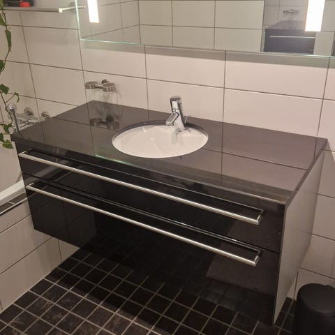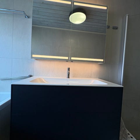 Baderomsinnredning bestående av servantskap med to skuffer, speil med overlys, høyskap og rektangulær servant i hvit utførelse. Servantskapet har mørk front med integrerte håndtak og innvendige inndelere i skuffene for organisering av baderomsutstyr. Høyskapet gir ekstra oppbevaringsplass til håndklær og toalettartikler. Innredningen er egnet for montering på bad og gir kombinert vaskeløsning og oppbevaring. Armatur til servant er ikke inkludert. Nedmontert og kan hentes fra mandag