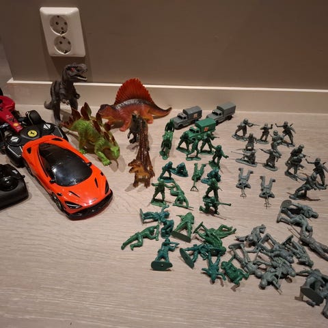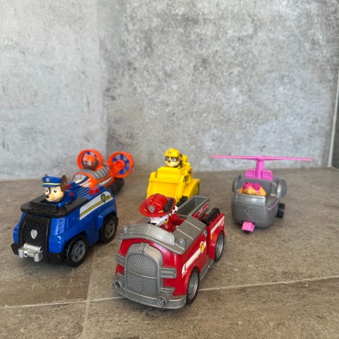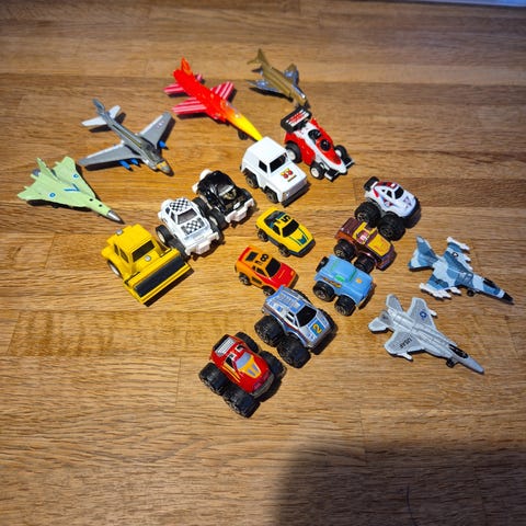 Blandet sett med små leker bestående av flere plastbiler og én hundefigur i byggeutstyr. Lekene er laget i hard plast i ulike farger, blant annet gul, grønn, blå, rød og oransje. Bilene er små og enkle å holde for barnehender, og noen har faste førerfigurer på toppen. Hundefiguren har hjelm og ryggsekk med verktøyform. Egner seg som lekesett for små barn som liker biler og figurer, og kan brukes både til rollelek og enkel billek på gulv eller bord.