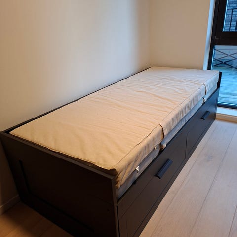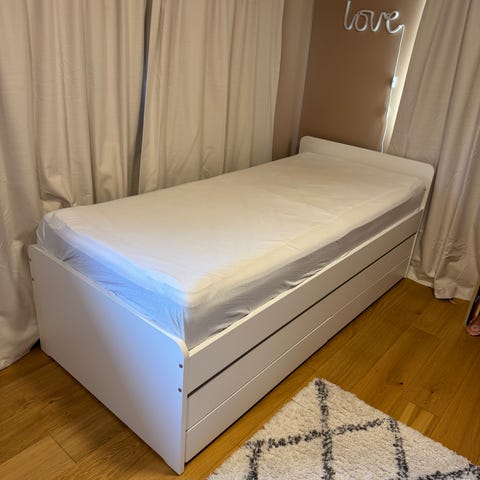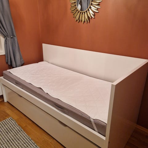 IKEA BRIMNES dagseng med to skuffer. Sengemål 80x200 cm. Under sengen er det to romslige oppbevaringsskuffer til sengetøy eller annet. Kan trekkes ut til dobbeltseng, eller brukes som enkeltseng evt. dagseng. Den er brukt som gjesteseng hos oss og er pent brukt, noen små bruksmerker (se bilde). Selges med to madrasser av merke Åsvang. Trekkene er nyvasket. Må hentes.