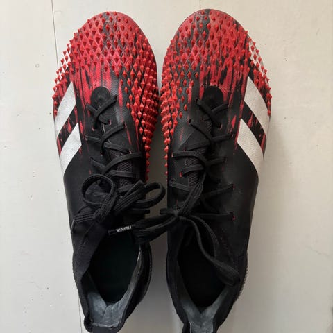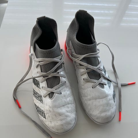 Adidas Predator fotballsko i hvit, grå og oransje farge. Overdel i syntetisk materiale med snøring for justerbar passform. Yttersåle med faste knotter til bruk på gress eller kunstgressbaner. Skoene har polstret hælparti og innersåle for økt komfort under spill. Egnet som fotballsko til trening og kamp.