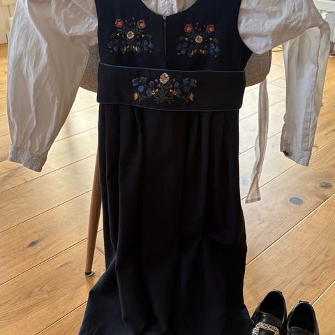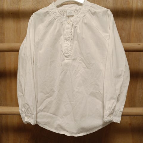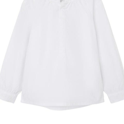 Name it bunadsskjorte for jente i størrelse 110. Blusen er hvit og laget av bomull. Den har lange ermer med mansjetter og knapper, delvis knappestolpe foran og lett rynkedetalj ved halsen.