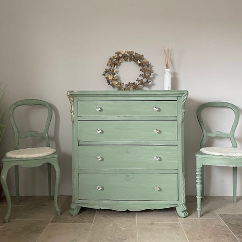 Kommode i heltre er laget av en møbelsnekker i Hokksund. Den er malt med vintage maling uten kjemikalier og har klassiske metallhåndtak og nøkkelhull på hver skuff