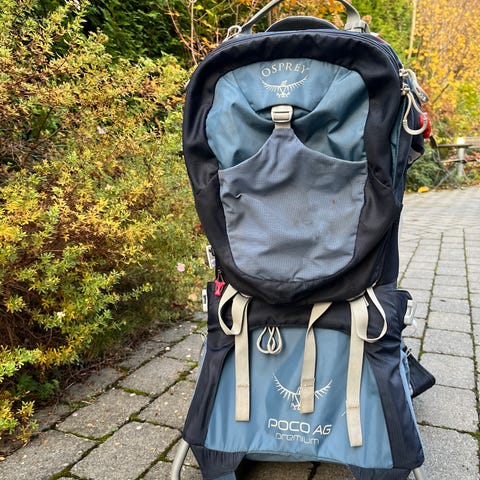 Blå bæremeis fra populære Osprey, med topp bærekomfort for voksen og sittekomfort for barn. Overraskende mye oppbevaringsplass - med både små og store lommer bak, på sidene og hoftebeltet (for enkel tilgang til nøkler, kort osv.).