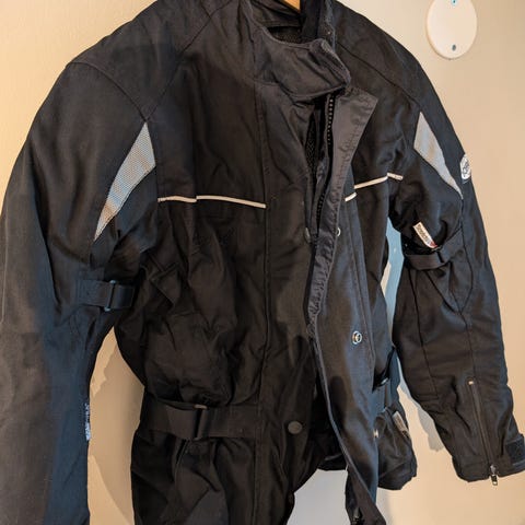 Touring Safety MC-dress for barn i todelt modell med bukse og jakke. Dressen er i svart og rød farge og har forsterkede felt ved knær og albuer. Jakken har belte i livet, flere lommer foran og høy krage. Buksen har justerbar linning med spenner. ekstra beskyttelse på utsatte områder.