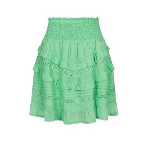 Modellen på skjørtet har bred, smocket strikk i livet og flere lag med volanger nederst som gir et lett og luftig uttrykk. Passer til hverdagsbruk eller mer pyntet.