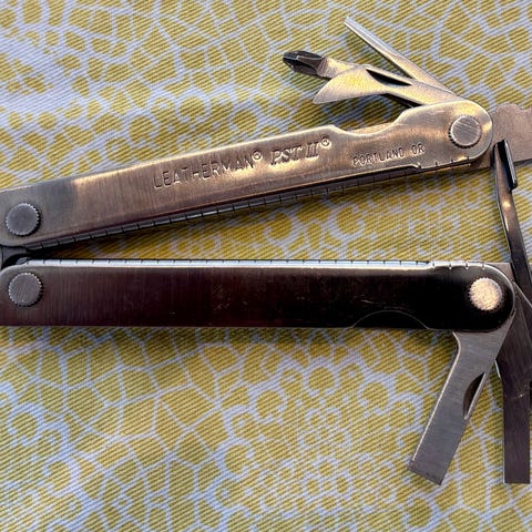 Strøken Leatherman Wave, multiverktøy i stål med tilhørende belteetui i skinn. Verktøyet har blant annet kombinasjonstang, avbitertang, knivblad, sag, fil, boksåpner, skrutrekkere, saks og flaskeåpner. Veier 286 gr .