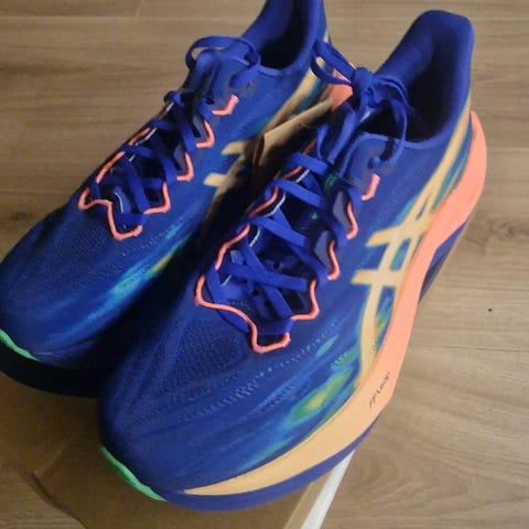 Asics løpesko i størrelse 44. Skoene har overdel i lett tekstilmateriale med lisser og mellomsåle med tydelig demping. Yttersåle med blå felter gir godt grep ved løping på hardt underlag. Fargekombinasjon hvit med blå detaljer. Egnet til løping og annen trening utendørs eller innendørs.