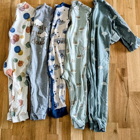 Alle pysjene har lang glidelås ned til foten. De enfargede grønne og blå samt pysjen med båter på har hel fot. Resten har åpen fot.