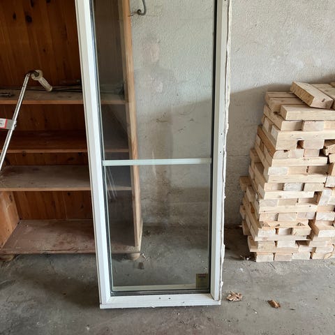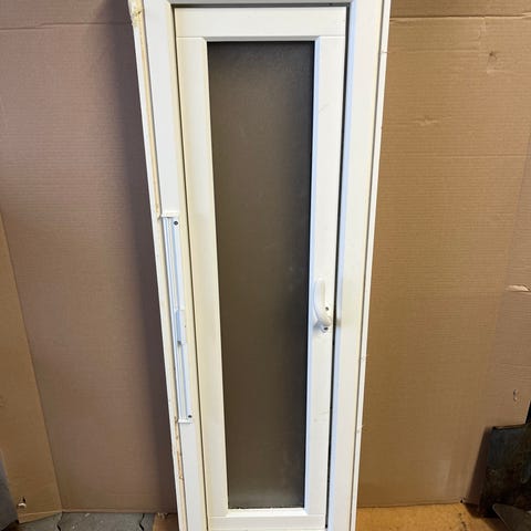 Vindu med karm i hvit utførelse. Rektangulær form med enkelt glassfelt og ramme i tre eller komposittmateriale med hvit overflate. Egnet til montering i yttervegg eller bod/garasje der det er behov for lysinnslipp. Vinduet leveres med eksisterende karm slik den fremstår på bildene.