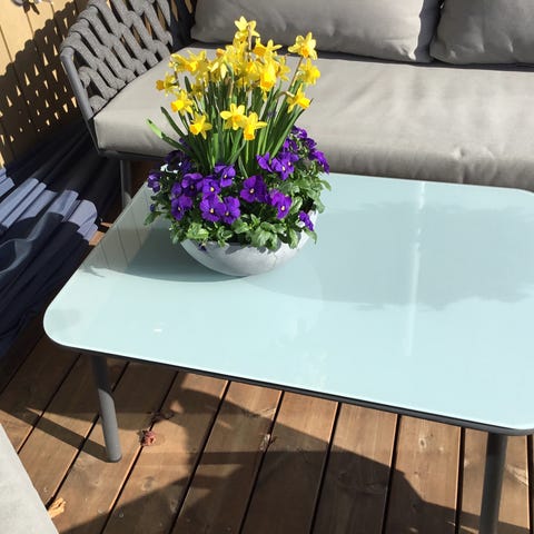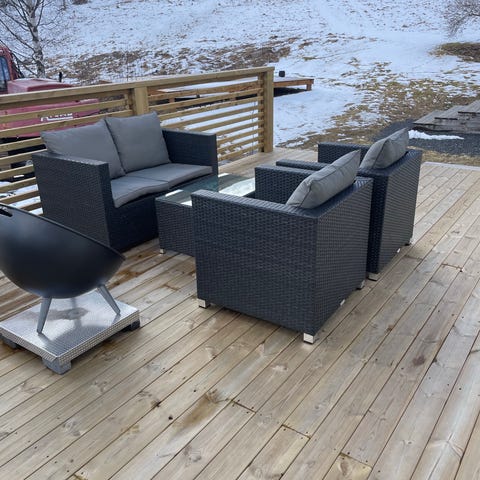 Utemøbler fra Trademax, 6 seter med putte, en stor glassbord og en puff