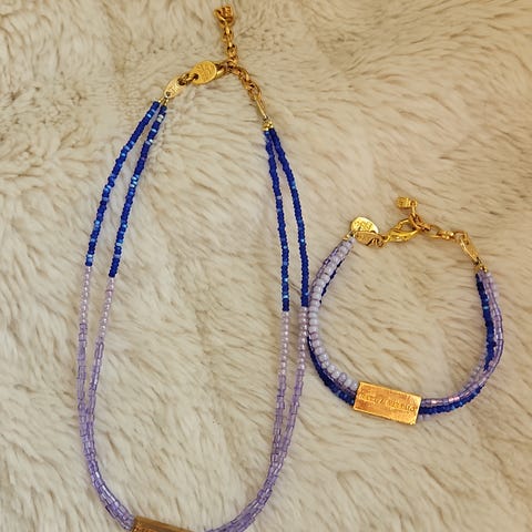 Dyrberg/Kern armbånd for dame i gullbelagt metall med krystaller. Armbåndet består av flere tynne lenker med små gullfargede ledd og fasetterte krystaller i ulike lillatoner samt enkelte perlelignende detaljer. Det har karabinlås og forlengerlenke for justerbar lengde. Lite anheng med Dyrberg/Kern-logo ved låsen.