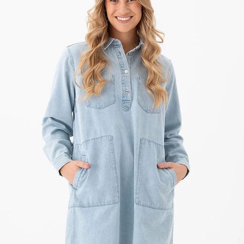 Part Two dongerikjole i blå denim i størrelse 40. Kjolen har lang erm, krage og knappelukking foran ned til brystet. Den har påsydde brystlommer og store lommer foran nederst. Laget i denim-materiale som gir et robust og uformelt uttrykk, egnet til hverdagsbruk alene eller sammen med strømpebukse eller bukse under.