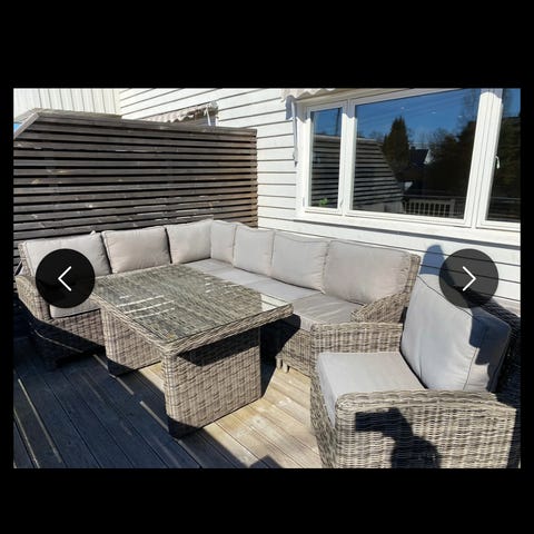 Modulsofa med puter til utebruk i hvit tekstil. Sofaen består av flere sammenkoblede moduler med høye side- og ryggstøtter. Setene er trukket i et lyst stoff som er egnet for utendørs bruk, og montert på en ramme i metall. Sofaen kan brukes på terrasse, balkong eller i hage som sittegruppe. Det følger med 3 sett med puter (slik som på bildet) som er blitt jevnlig vasket og oppbevart inne gjennom vinteren og våren. Trekkene kan tas av og vaskes.