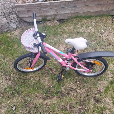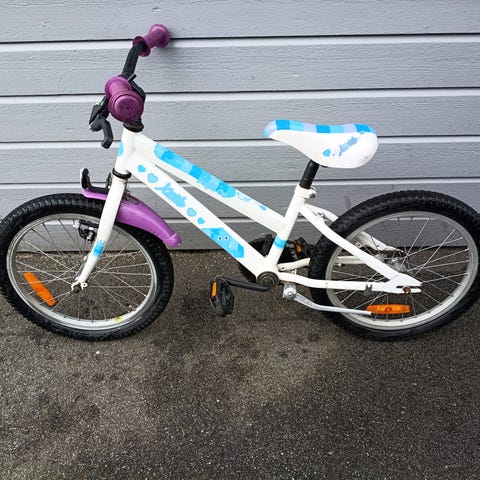 Barnesykkel med 16" hjul i hvit og lilla farge. Sykkelen har rett styre med håndtak i lilla, samt sete i hvit/blå/lilla. Den er utstyrt med skjerm bak, kjedekasse og fotbrems. Egnet som barnesykkel for mindre barn som passer 16" hjulstørrelse.