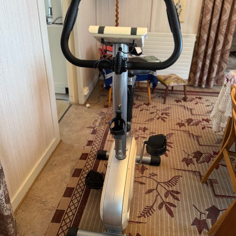 Actilo trimsykkel med justerbar motstand i hvit og svart farge. Sykkelen har et polstret sete i rødlilla tekstil og et stabilt stativ med pedaler og fotstøtte. Styret har innebygd konsoll som kan vise grunnleggende treningsdata (for eksempel tid og antall tråkk, avhengig av modell). Motstanden kan justeres manuelt med dreiehjul på rammen. Egnet til enkel kondisjons- og mosjonstrening innendørs for voksne brukere.