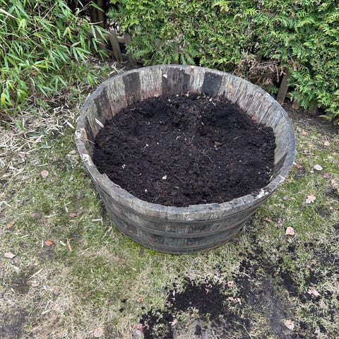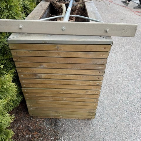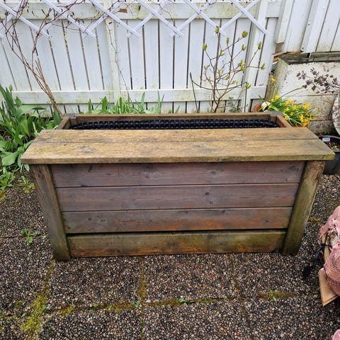 Blomsterkasse med espalier i tre, malt svart. Rektangulær kasse nederst med åpen bunn for jord og drenering, og høyt espalier bak for klatreplanter. Egnet til bruk utendørs på terrasse, balkong eller i hage for planting av blomster, urter eller klatreplanter.