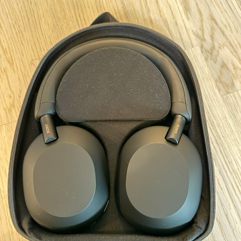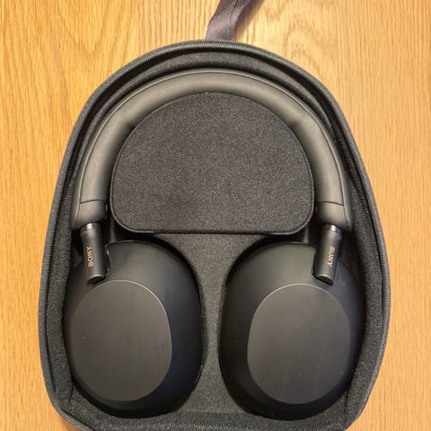 Sony WH-1000XM5 hodetelefoner, trådløse over-ear i svart farge. Modellen leveres med et formtilpasset etui for oppbevaring.