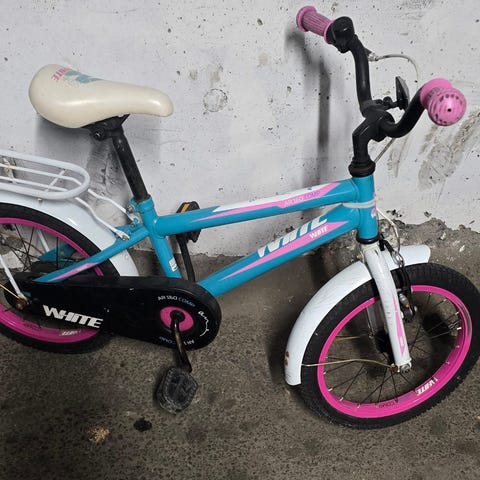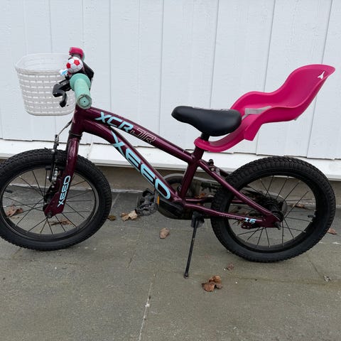 Selger en veldig pen og lite brukt Merida 16 tommer barnesykkel i rosa.