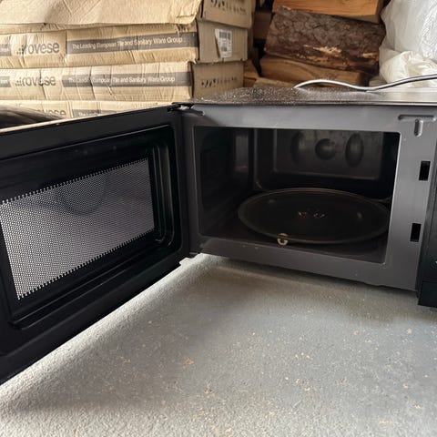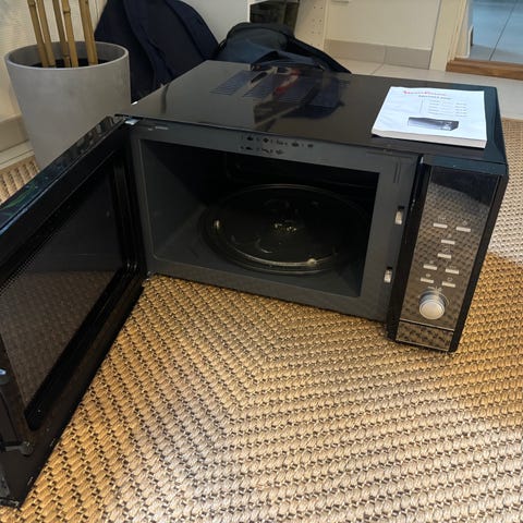 Husqvarna mikrobølgeovn i svart utførelse. Front med glassdør og betjeningspanel på siden med flere funksjonsknapper.