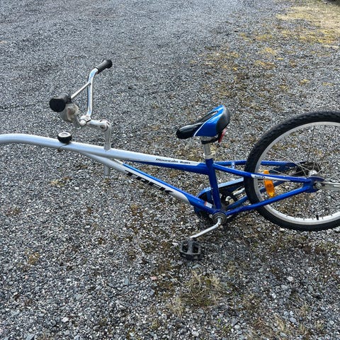 Sykkeltilhenger for barnesykkel med 20" hjul. Modellen har ett hjul bak og feste foran for montering på voksensykkel, slik at barn kan sitte på og trå sammen med den som sykler foran. Fargen er svart. Egner seg som tilhenger-/følgesykkel for barn som vil være med på lengre turer, men fortsatt ha støtte fra en voksen sykkel foran.