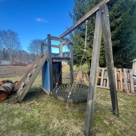 Huske- og klatrestativ i tre. Stativet består av en huskestativ-del med to røde plastseter opphengt i tau/kjetting, samt en klatrevegg i tre med klatregrep. Det følger også med en tverrstang med håndtak og ringer som kan festes i stativet. Egnet som utendørs lekeapparat for barn, montert på trestativ som kan plasseres i hage eller på uteområde. Materiale hovedsakelig treverk med metallfester og plastseter på huskene.