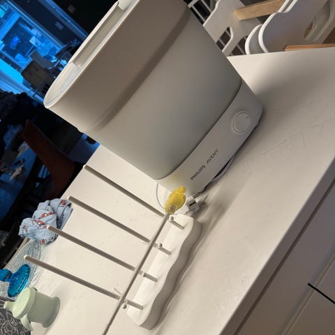 Baby Brezza sterilisator og tørker for tåteflasker i hvit plast. Enheten har avtakbar vanntank og rist med holdere for flasker og tilbehør. Leveres med ekstra små beholdere og tilhørende veggplate med spor for oppheng og organisering av deler. Egnet til sterilisering og tørking av tåteflasker, smokker og annet babyutstyr i plast og glass etter rengjøring.