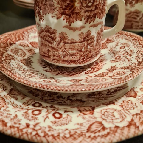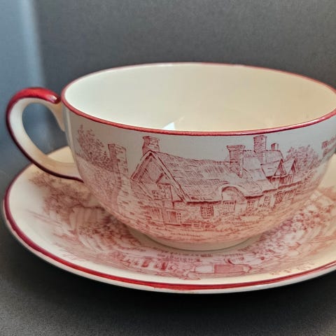 7 kopper m/skål i serien "Old Britain Castle" rød, fra Johnson Brothers.