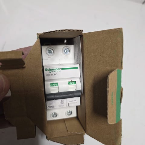 CHINT NL210 jordfeilautomat 63A type B. Enheten er beregnet for beskyttelse mot jordfeil og overstrøm i elektriske installasjoner. Den har fire tilkoblingsklemmer på toppen og bryterhendel i front. På fronten er det også skjema for intern kobling og tekniske data. Leveres i original eske med medfølgende dokumentasjon/brukerveiledning synlig på bildet.