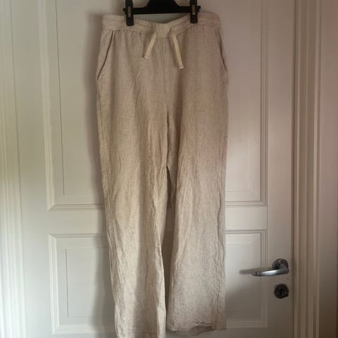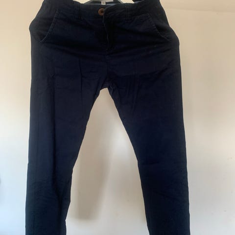 Bukse for gutt i størrelse 152. Buksen er mørke blå og laget i lin. Den har strikk og snøring i livet samt sidelommer.