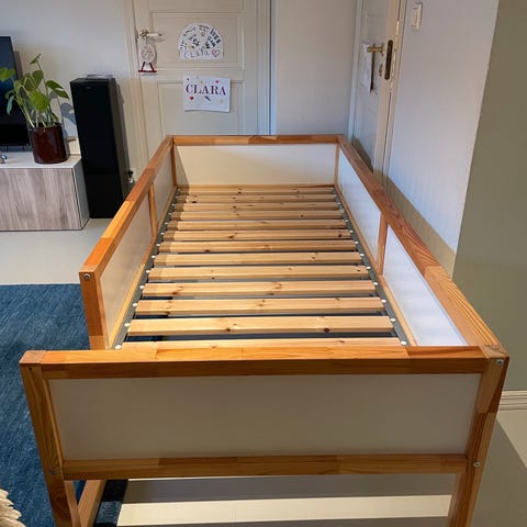 IKEA Kura for barn. Sengen har ramme i lyst treverk med hvite paneler. Den kan brukes både som lav seng og som loftseng ved å snu rammen. Egnet for barnerom der man ønsker å utnytte plassen under sengen til lek eller oppbevaring. Madrassmål følger standard enkeltseng for barn (ca. 90 x 200 cm, avhengig av modell).