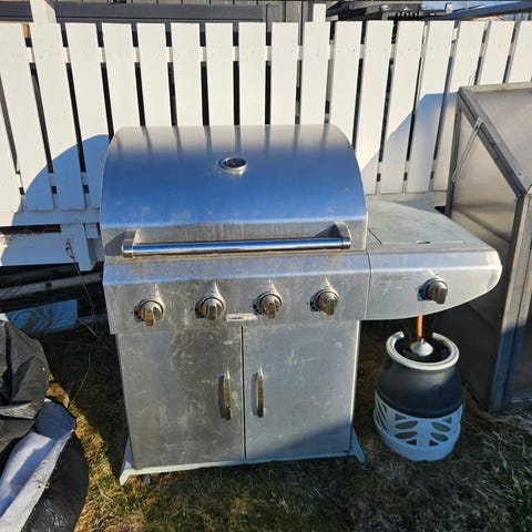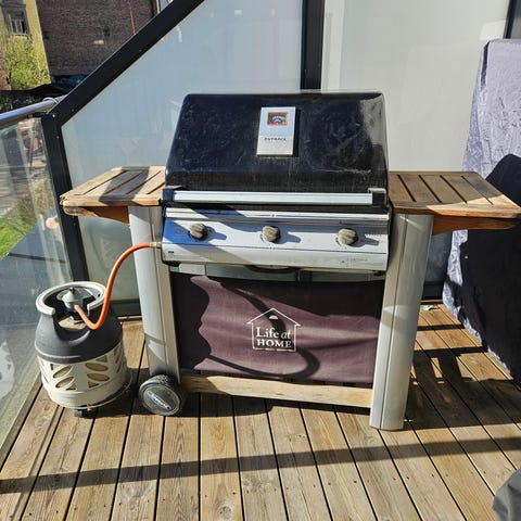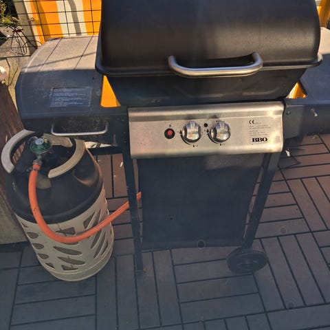 Gassgrill, brukt noen få ganger, men stått ute og fått merker og rust. Virket bra sist vi brukte den. Mulig det går an å kjøpe nye deler, det er i allefall lett å ta deler ut og inn av grillen. Følger ikke med gassflaske, men kan kjøpes ved siden av. Følger med en tenner, gjøres manuelt, vet ikke om den virker uten.