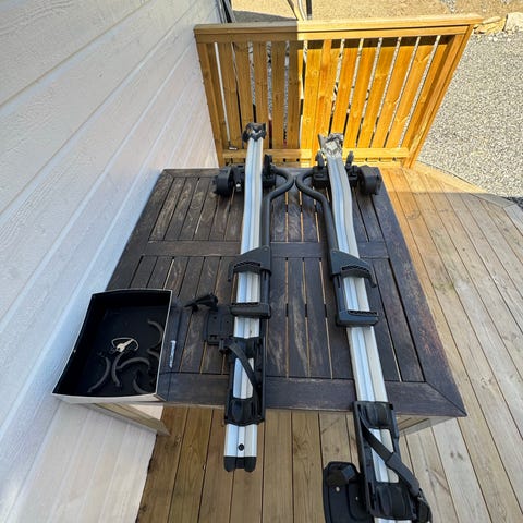 Pakken på bildene viser stativet med monteringsdeler og bruksanvisning. Stativet festes til eksisterende takbøyler/takstativ på bilen i henhold til instruksjonene fra Thule. Egnet for transport av én sykkel om gangen, innenfor vekt- og dimensjonsgrenser angitt av produsenten.