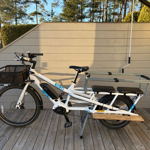 Praktisk elsykkel / lastesykkel med mye utstyr til salgs. Vi har brukt sykkelen til å frakte to små barn i hverdagen, men den egner seg også godt til å frakte mye bagasje. Sykkelen og ekstrautstyret ble kjøpt ny av oss på Suchi Elsykkel i Sandvika. Den er relativt lite brukt (kun 1868km) og har mye liv igjen.