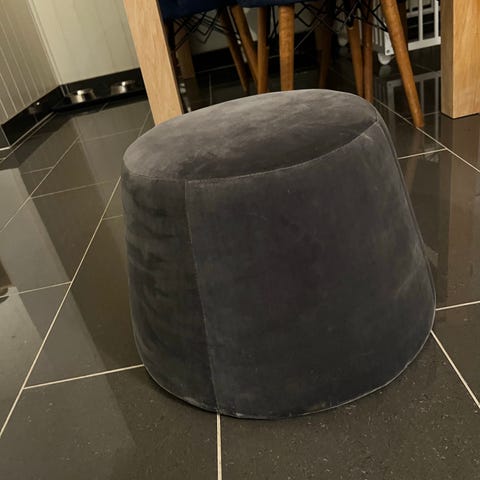 Svart understell og grått trekk på sitteputen. Ikke mulig å ta av trekket for vask, men ser ingen flekker av betydning.
