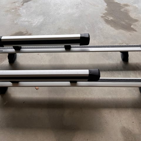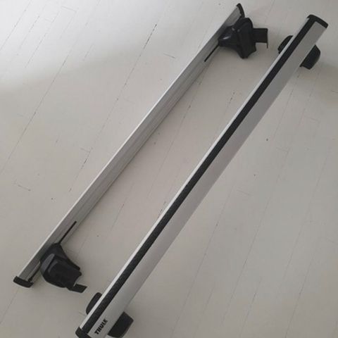 Lite brukt Thule Wingbar takstativ i aluminium i sølvfarge med sorte plastføtter og integrert låsesystem.
