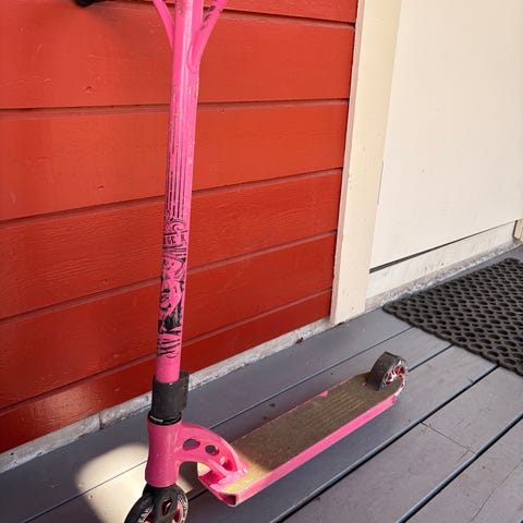 Rezo sparkesykkel i svart farge med rosa hjul. Styrestangen er justerbar i høyden og har sorte håndtak. Deck har trykket Rezo-logo og mønster, og bakhjulet har fotbrems. Egnet som sparkesykkel til barn til bruk på jevnt underlag som asfalt eller belegningsstein.