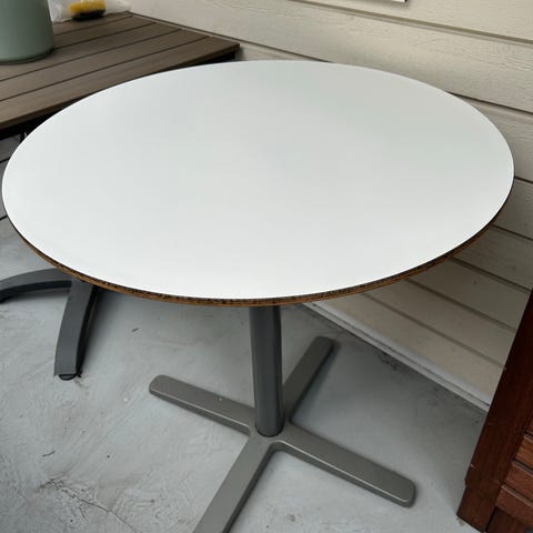Kjøkkenbord fra Skeidar med metallunderstell. Bordplaten er slitt og trenger puss/maling. Må hentes.