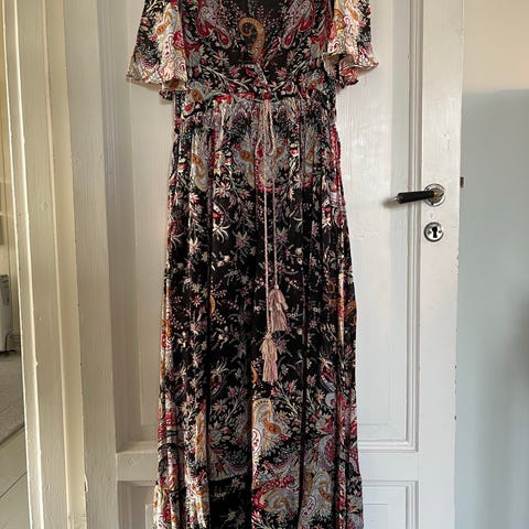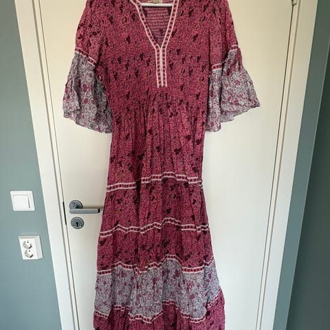 Indiska hverdagskjole i grå bomull for dame i størrelse S. Kjolen har ankellengde, V-utringning og 3/4-lange ermer med heklet blondekant. Midjepartiet har broderte detaljer i røde og lyse nyanser foran og bak. Stoffet er lett og noe transparent i overdelen, med rynker som gir et mykt fall i skjørtet. Egnet som hverdagskjole eller til enkle anledninger.