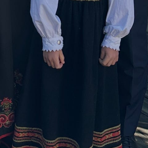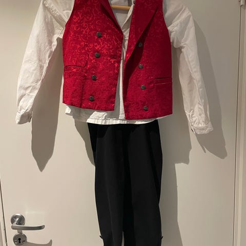 bunadssett for gutt i størrelse 122. Settbestår av skjorte, vest, knebukse og tilbehør som vist på bildet. Passer til bruk ved høytider, 17. mai og andre anledninger der bunadsinspirert antrekk er ønsket.