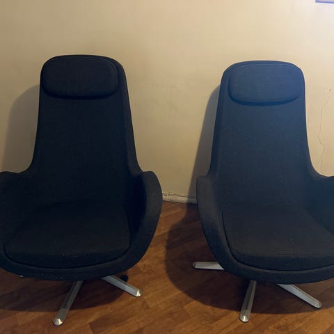 Selger to Ea116 Lounge chair designet i 1958 av Charles og Ray Eames. Stolene er med sort ull tekstil og fremstår som hele og fine. Dette er et design- ikon og man sitter behagelig i denne lounge chair. Høyde: 92 cm(fra gulv til overkant rygg) Bredde 55 cm, Dybde - sittedybde 44 -73 cm. Sittehøyde 37 cm. Prisen er pr. stk.