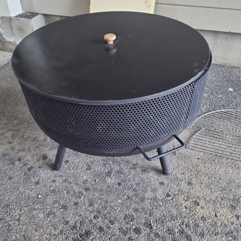 Rund ildskål med gnistfanger. Grillrist kan plasseres på 3 forskjellige nivåer. Det følger med et tilpasset trekk for beskyttelse ved lagring utendørs.