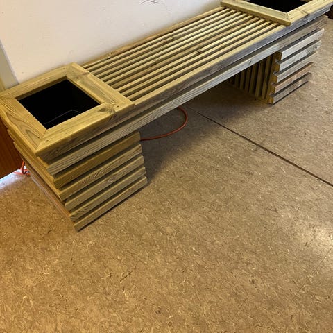 Stilren utebenk med integrerte plantekasser