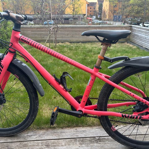 Noe bruksmerker, ventilene til dekkene er litt skjeve, men sykkelen er i god stand. Skjermer og støtte er ettermontert og følger med.