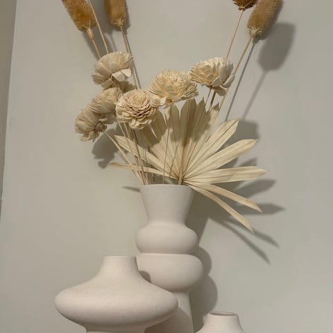 Superfine falske blomster i rosa og beige, og gull vase fra H&M Home. Selges separat eller samlet til 300 kr.