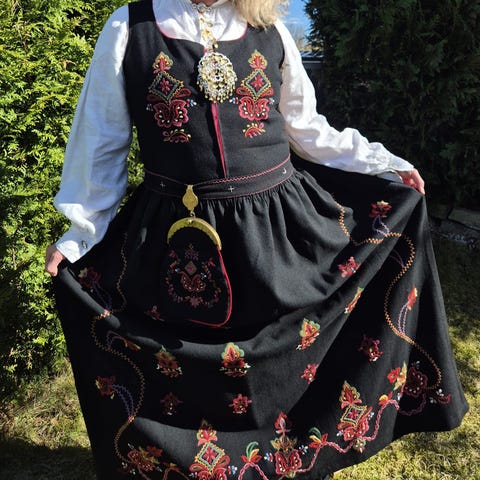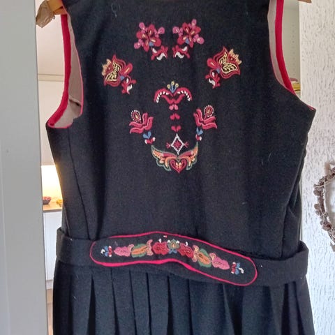 Jeg vurderer å selge min sunnmørsbunad rett og slett fordi jeg ikke bruker den lenger. Bunaden selges med cape som er foret inni og tilhørende veske. Både vesken og capen har sølv som følger med, fordi dette er sydd fast. Skjorte og sølv følger ikke med. Jeg vil si den er ca en XL i størrelse, men den har ekstra stoff på innsiden slik at den kan sys inn og ut etter ønske. Jeg er 167cm høy.