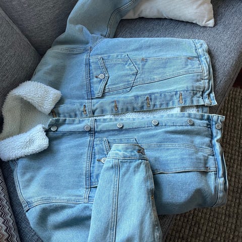 Veldig kul denimjakke med teddyfor. Ville gjerne beholdt den selv, men den er dessverre for liten for meg. Passer en som bruker str S og XS.