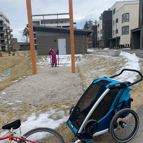 Selger en solid og romslig Thule Chariot Cab 2 med Thule Chariot skisett. Perfekt for aktive familier som vil bruke vognen året rundt – både til sykling, trilleturer og skiturer.