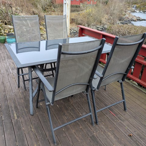 Hagebord med 4 stoler i metall. Bordet er i grå farge, egnet for bruk på terrasse eller uteplass.