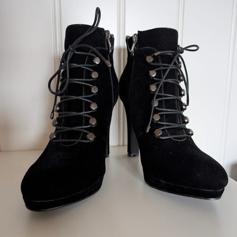 er både trendy og allsidig, og passer like godt til jeans som til kjole, og gir antrekket et litt mer edgy preg. Lav hæl, komfortabel å gå i. Merke: Monterio Ribas (produsert i Portugal). Selges fordi de er for små. Ny pris 1299 nok.
