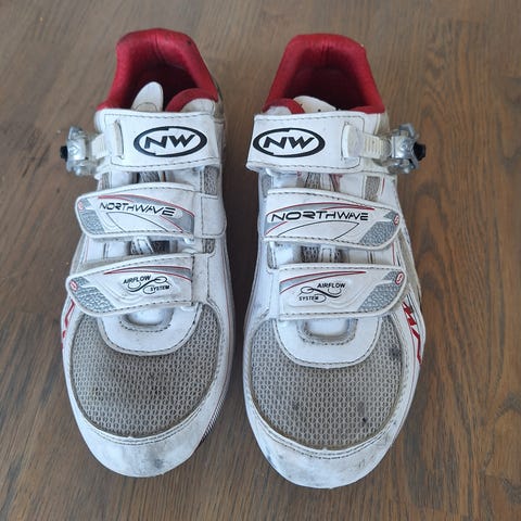 Spiuk ZS11SL sykkelsko i størrelse 41. Modellen er en landeveissko med stiv såle, egnet for bruk med landeveispedaler. Skoene har overdel i syntetisk materiale med ventilasjonsfelt og flere borrelåsstropper kombinert med en justerbar spenne for sikker lukking og god tilpasning. Fargen er rød med hvite detaljer. Egnet for sykling på landevei og trening der det brukes klikkpedaler som passer til denne typen sykkelsko.